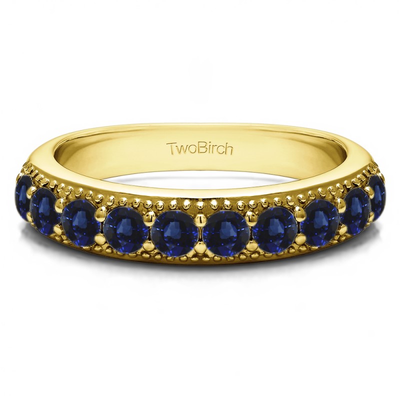This wedding ring features 11 round prong set stones with a 2 millimeter wide band. The total combined carat weight of the ring is 0.25 carats. It features a small row of millgraining on each side of the band. This wedding ring weighs approximately 4.48 grams.