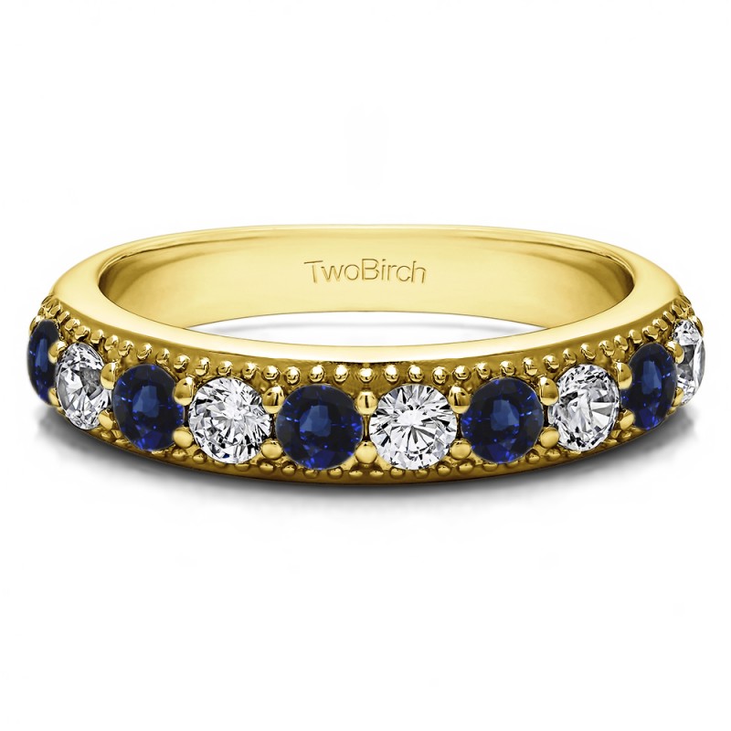 This wedding ring features 11 round prong set stones with a 2 millimeter wide band. The total combined carat weight of the ring is 0.25 carats. It features a small row of millgraining on each side of the band. This wedding ring weighs approximately 4.48 grams.