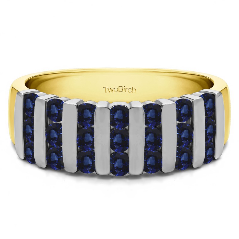 This wedding ring features 21 round bar set stones with a 2 millimeter wide band. The total combined carat weight of the ring is 0.26 carats. It has a unique three row design, set with shared bars. The shared bars are finished with a high polish. This wedding ring weighs approximately 4.39 grams.
