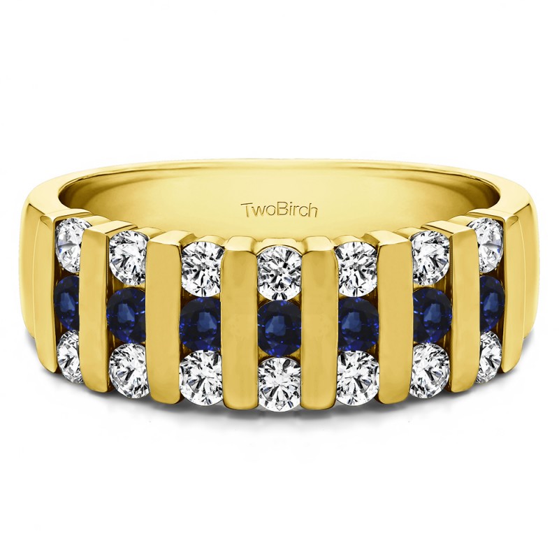 This wedding ring features 21 round bar set stones with a 2 millimeter wide band. The total combined carat weight of the ring is 0.26 carats. It has a unique three row design, set with shared bars. The shared bars are finished with a high polish. This wedding ring weighs approximately 4.39 grams.