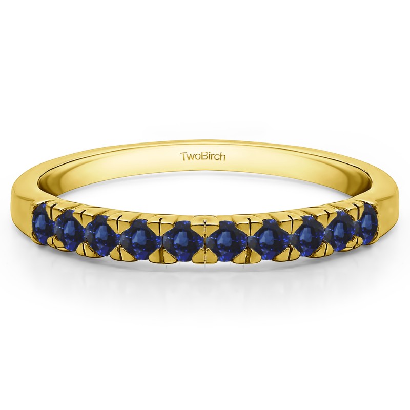 This wedding ring features 10 round prong set stones with a 2 millimeter wide band. The total combined carat weight of the ring is 0.3 carats. It has stunning illusion setting also referred to as French cut. This wedding ring weighs approximately 2.96 grams.