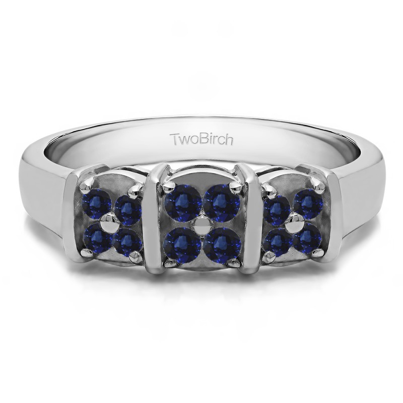 This wedding ring features 12 round bar set stones with a 2 millimeter wide band. The total combined carat weight of the ring is 0.31 carats. It is set in a way that gives the stones the appearance of a flower. This wedding ring weighs approximately 4.45 grams.