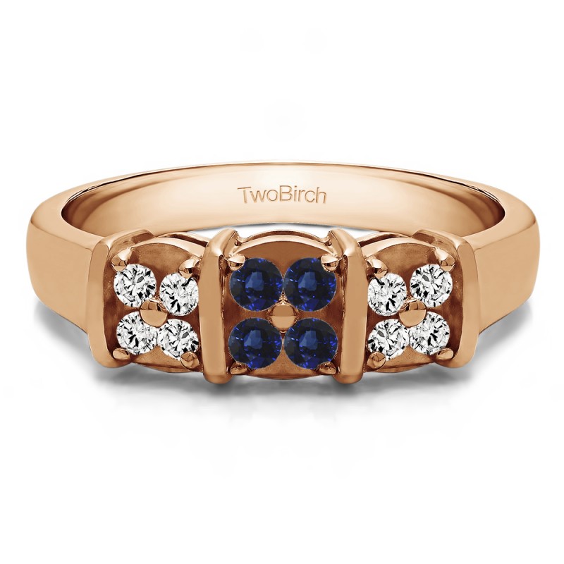 This wedding ring features 12 round bar set stones with a 2 millimeter wide band. The total combined carat weight of the ring is 0.31 carats. It is set in a way that gives the stones the appearance of a flower. This wedding ring weighs approximately 4.45 grams.