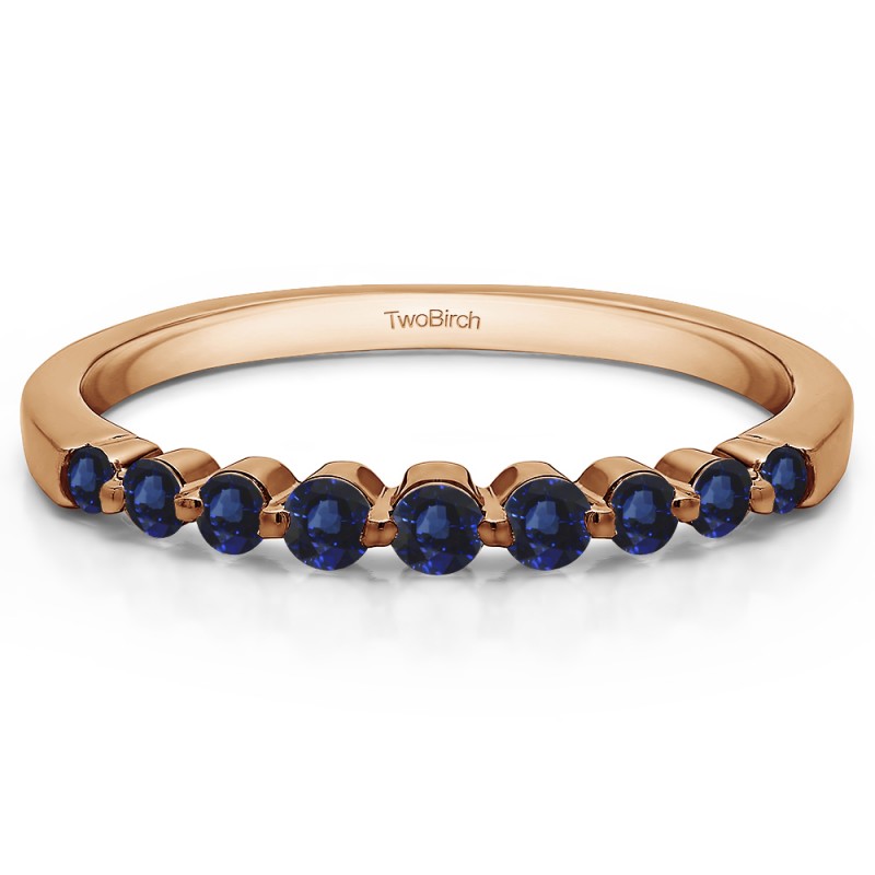 This wedding ring features 9 round bezel set stones with a 2 millimeter wide band. The total combined carat weight of the ring is 0.33 carats. It has a pinched shank and stones set with a shared prong. This wedding ring weighs approximately 2.75 grams.