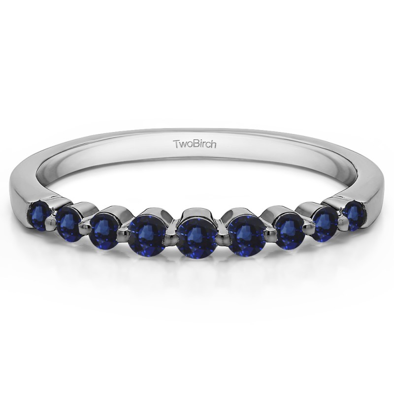 This wedding ring features 9 round bezel set stones with a 2 millimeter wide band. The total combined carat weight of the ring is 0.33 carats. It has a pinched shank and stones set with a shared prong. This wedding ring weighs approximately 2.75 grams.
