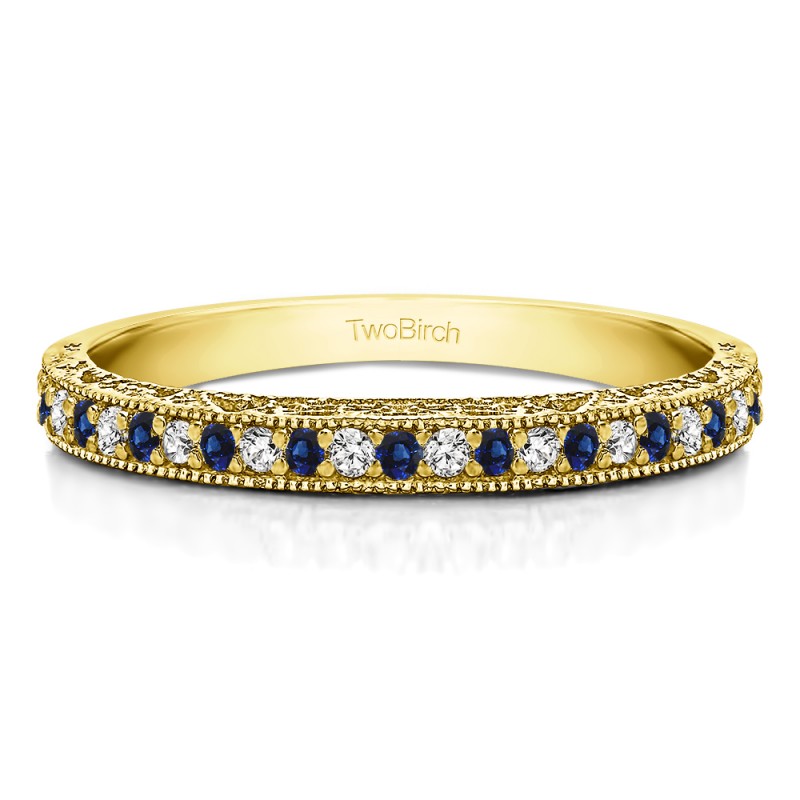 This wedding ring features 26 round prong set stones with a 2 millimeter wide band. The total combined carat weight of the ring is 0.34 carats. The ring has pave set round stones with milgraining and filigree designs. This wedding ring weighs approximately 3.15 grams.
