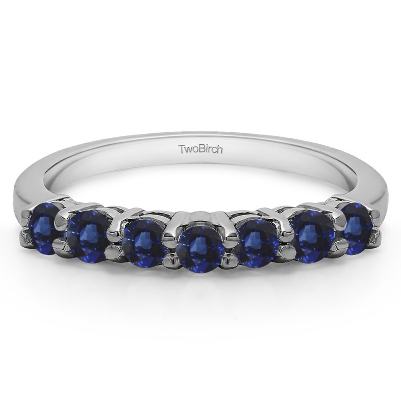 This wedding ring features 7 round prong set stones with a 2 millimeter wide band. The total combined carat weight of the ring is 0.42 carats. It has basket style settings. This wedding ring weighs approximately 2.79 grams.