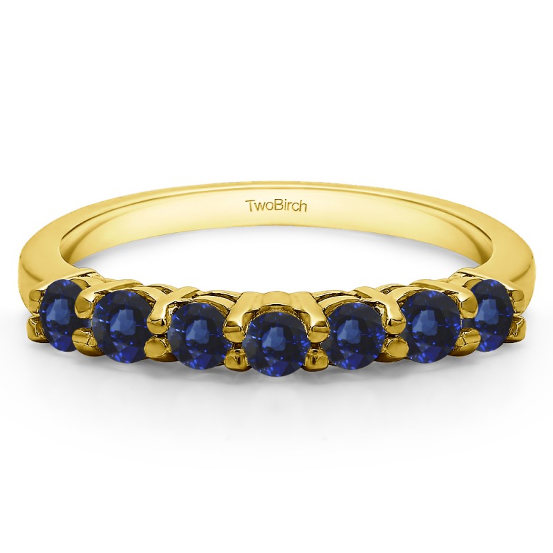This wedding ring features 7 round prong set stones with a 2 millimeter wide band. The total combined carat weight of the ring is 0.42 carats. It has basket style settings. This wedding ring weighs approximately 2.79 grams.