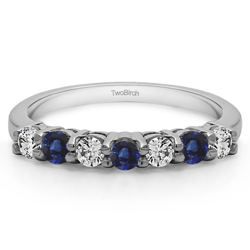 This wedding ring features 7 round prong set stones with a 2 millimeter wide band. The total combined carat weight of the ring is 0.42 carats. It has basket style settings. This wedding ring weighs approximately 2.79 grams.