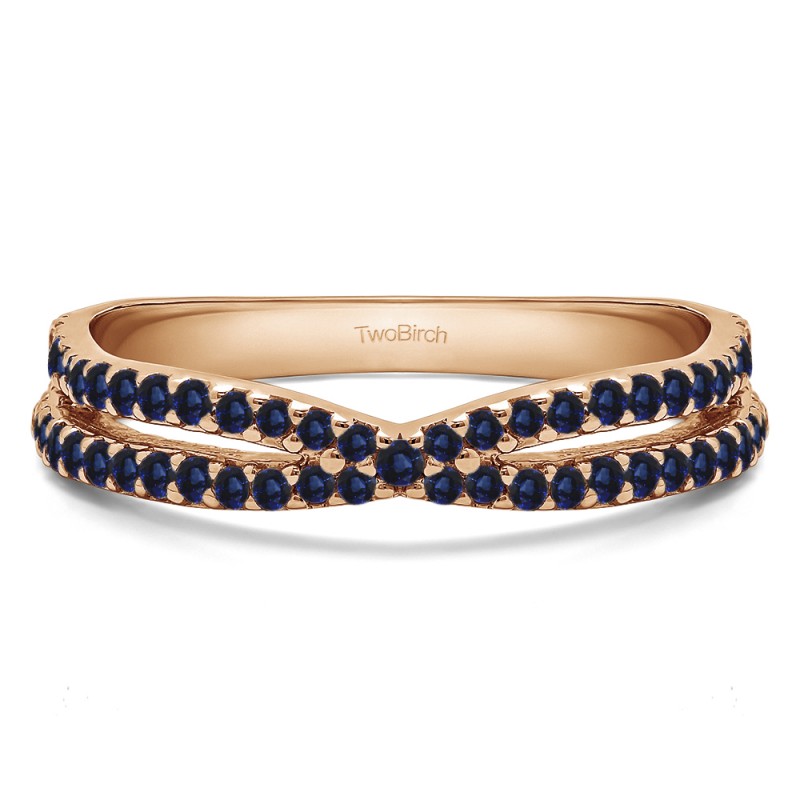 This wedding ring features 61 round prong set stones with a 2 millimeter wide band. The total combined carat weight of the ring is 0.46 carats. This ring has a criss cross design with a single row of stones accenting the design. This wedding ring weighs approximately 6.24 grams.