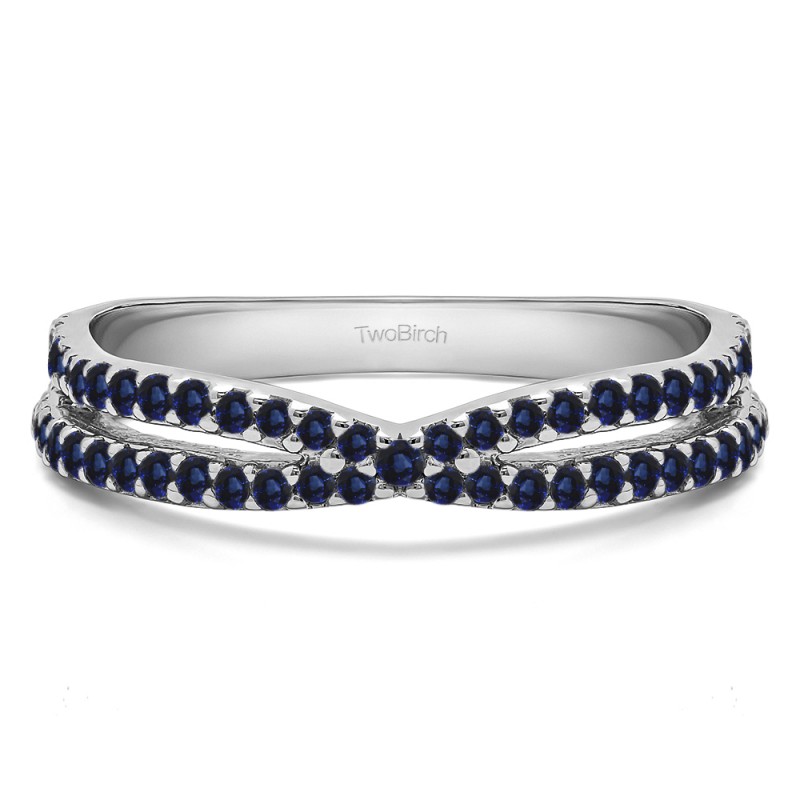 This wedding ring features 61 round prong set stones with a 2 millimeter wide band. The total combined carat weight of the ring is 0.46 carats. This ring has a criss cross design with a single row of stones accenting the design. This wedding ring weighs approximately 6.24 grams.
