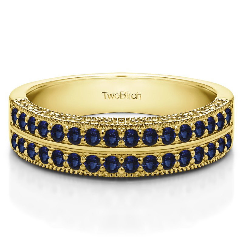 This wedding ring features 32 round prong set stones with a 2 millimeter wide band. The total combined carat weight of the ring is 0.48 carats. It has double row of stones with millgraining and filigree designs. This wedding ring weighs approximately 6.62 grams.