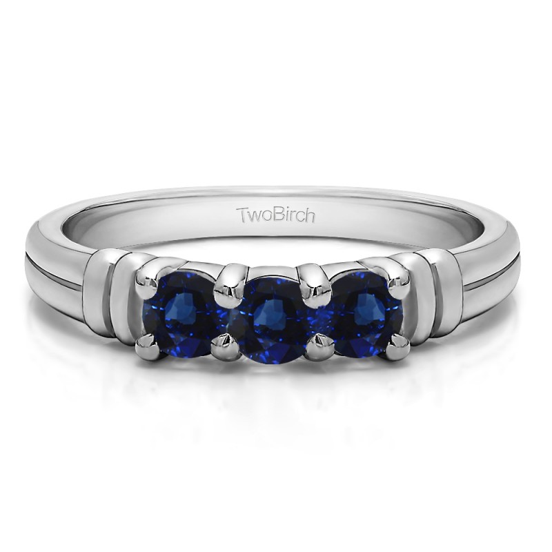 This wedding ring features 3 round prong set stones with a 2 millimeter wide band. The total combined carat weight of the ring is 0.48 carats. It has three stones accented with raised bars. This wedding ring weighs approximately 5.41 grams.