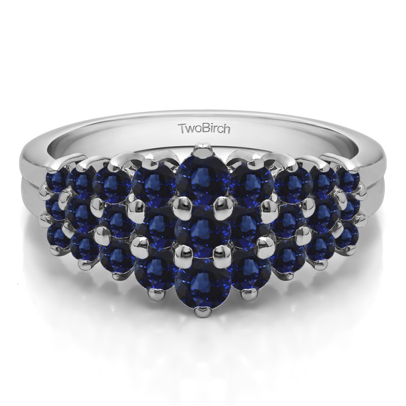 This wedding ring features 27 round prong set stones with a 2 millimeter wide band. The total combined carat weight of the ring is 0.49 carats. It has three rows of shared prong round stones in a domed design. This wedding ring weighs approximately 4.9 grams.