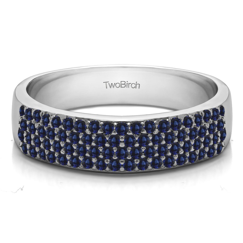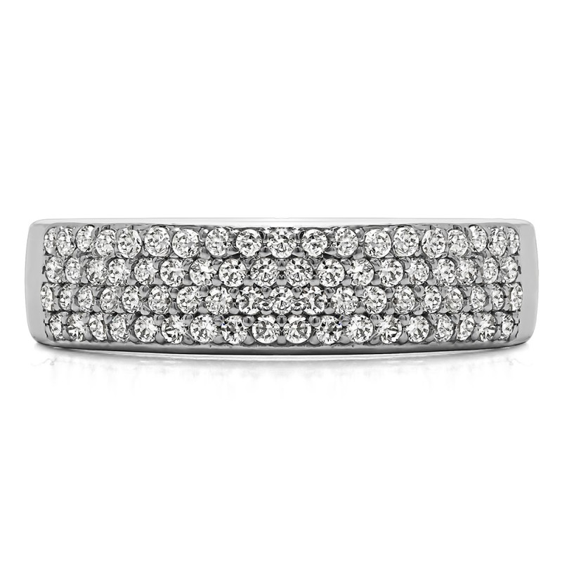 This wedding ring features 40 round prong set stones with a 2 millimeter wide band. The total combined carat weight of the ring is 0.49 carats. It has a double row of round stones set with shared prongs. This wedding ring weighs approximately 6.5 grams.