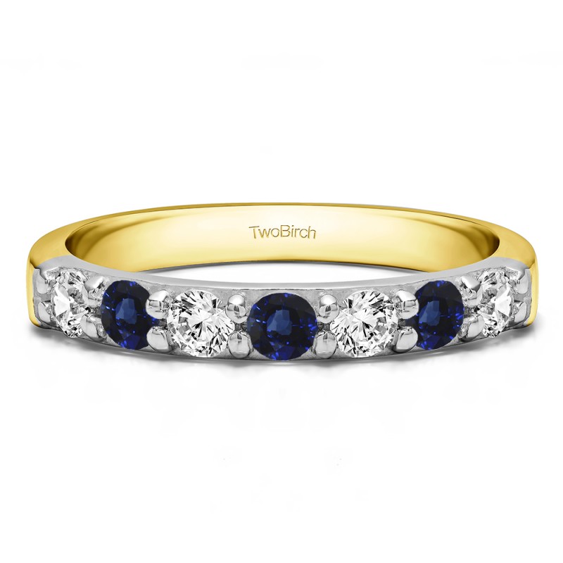 This wedding ring features 7 round prong set stones with a 2 millimeter wide band. The total combined carat weight of the ring is 0.49 carats. Round brilliant cut stones are set in common prongs, making it both stunning and secure. This wedding ring weighs approximately 4.79 grams.