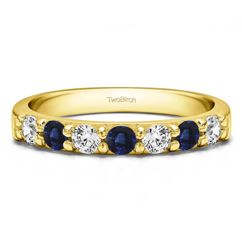 This wedding ring features 7 round prong set stones with a 2 millimeter wide band. The total combined carat weight of the ring is 0.49 carats. Round brilliant cut stones are set in common prongs, making it both stunning and secure. This wedding ring weighs approximately 4.79 grams.