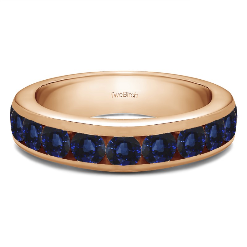 This wedding ring features 10 round channel set stones with a 2 millimeter wide band. The total combined carat weight of the ring is 0.5 carats. It has a high polish finish. This wedding ring weighs approximately 4.95 grams.