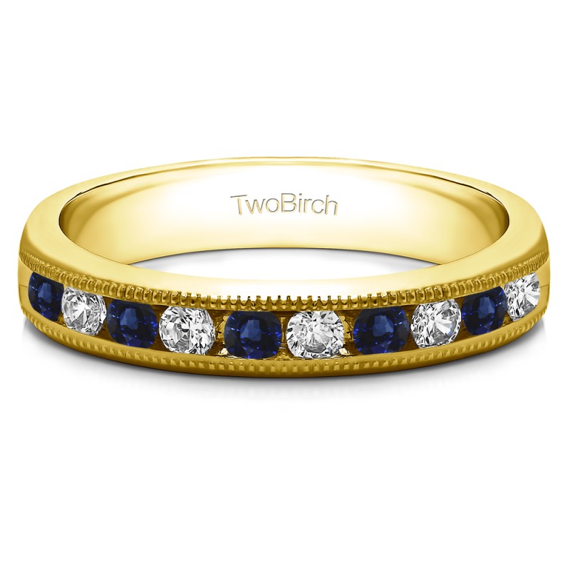 This wedding ring features 10 round channel set stones with a 2 millimeter wide band. The total combined carat weight of the ring is 0.5 carats. It has a channel set design with millgrained edges. This wedding ring weighs approximately 4.75 grams.
