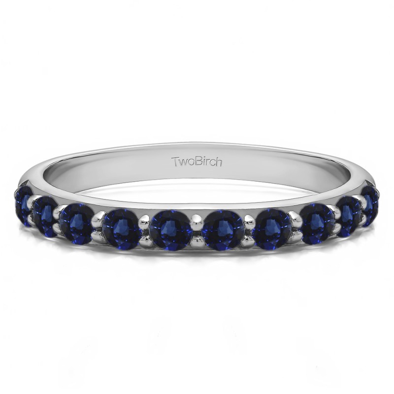 This wedding ring features 10 round prong set stones with a 2 millimeter wide band. The total combined carat weight of the ring is 0.5 carats. It has shared prongs, set low, making it perfect to wear on its own or to accompany any style engagement ring. This wedding ring weighs approximately 4.16 grams.
