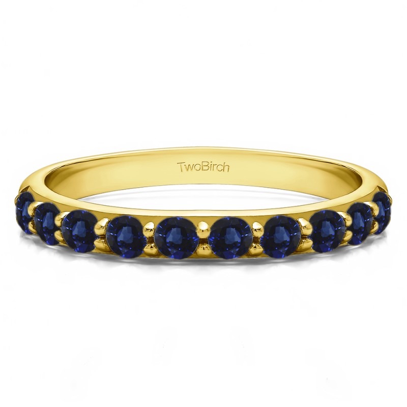 This wedding ring features 10 round prong set stones with a 2 millimeter wide band. The total combined carat weight of the ring is 0.5 carats. It has shared prongs, set low, making it perfect to wear on its own or to accompany any style engagement ring. This wedding ring weighs approximately 4.16 grams.
