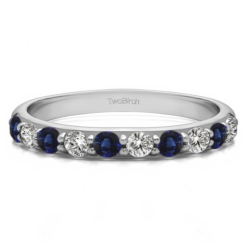 This wedding ring features 10 round prong set stones with a 2 millimeter wide band. The total combined carat weight of the ring is 0.5 carats. It has shared prongs, set low, making it perfect to wear on its own or to accompany any style engagement ring. This wedding ring weighs approximately 4.16 grams.