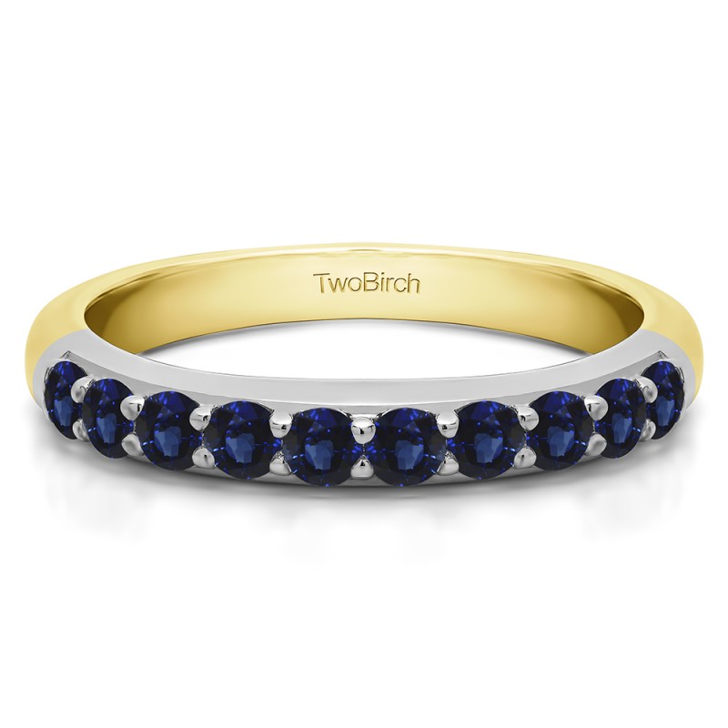 This wedding ring features 10 round prong set stones with a 2 millimeter wide band. The total combined carat weight of the ring is 0.5 carats. It has a low profile making it perfect to fit with any style of engagement ring. This wedding ring weighs approximately 3.91 grams.
