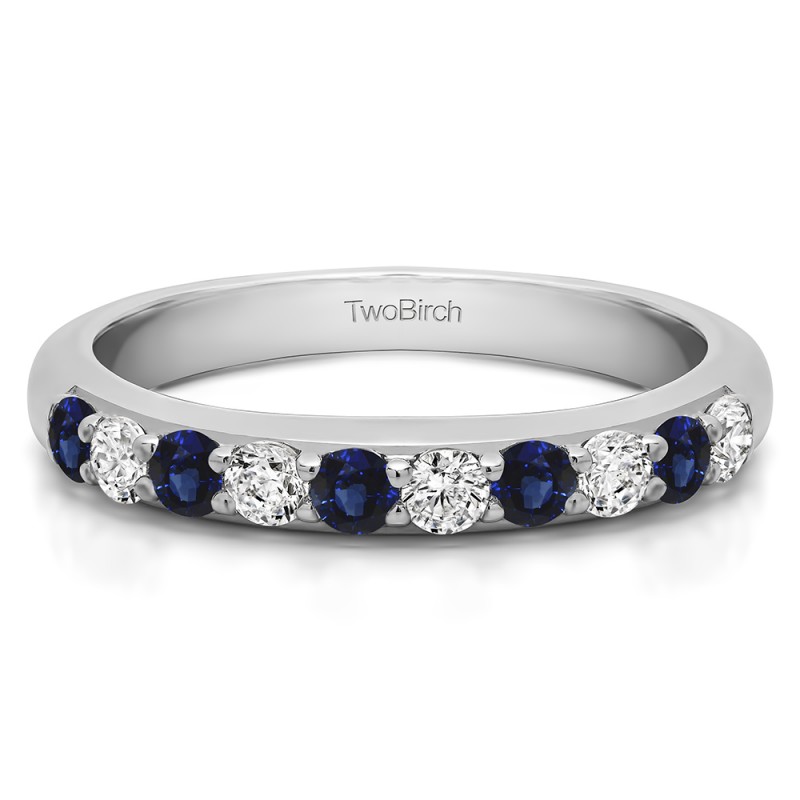 This wedding ring features 10 round prong set stones with a 2 millimeter wide band. The total combined carat weight of the ring is 0.5 carats. It has a low profile making it perfect to fit with any style of engagement ring. This wedding ring weighs approximately 3.91 grams.