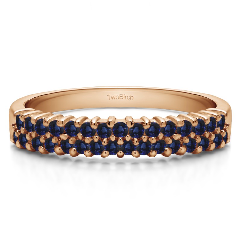 This wedding ring features 30 round prong set stones with a 2 millimeter wide band. The total combined carat weight of the ring is 0.5 carats. It features a double row of shared prong set round stones. This wedding ring weighs approximately 3.35 grams.