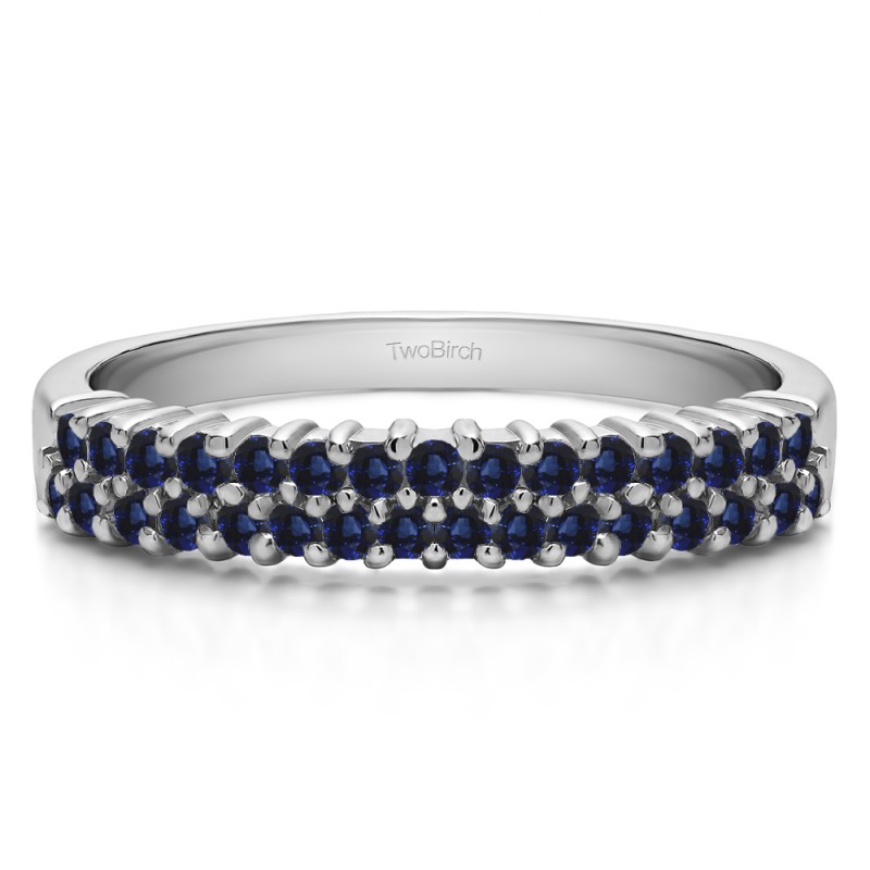 This wedding ring features 30 round prong set stones with a 2 millimeter wide band. The total combined carat weight of the ring is 0.5 carats. It features a double row of shared prong set round stones. This wedding ring weighs approximately 3.35 grams.