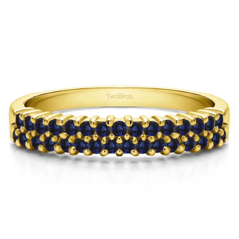 This wedding ring features 30 round prong set stones with a 2 millimeter wide band. The total combined carat weight of the ring is 0.5 carats. It features a double row of shared prong set round stones. This wedding ring weighs approximately 3.35 grams.