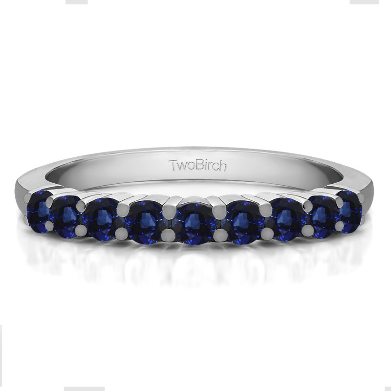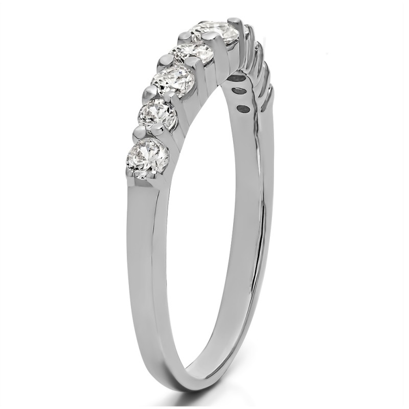 This wedding ring features 9 round prong set stones with a 2 millimeter wide band. The total combined carat weight of the ring is 0.5 carats. It features a double row of shared prong set round stones. This wedding ring weighs approximately 2.87 grams.