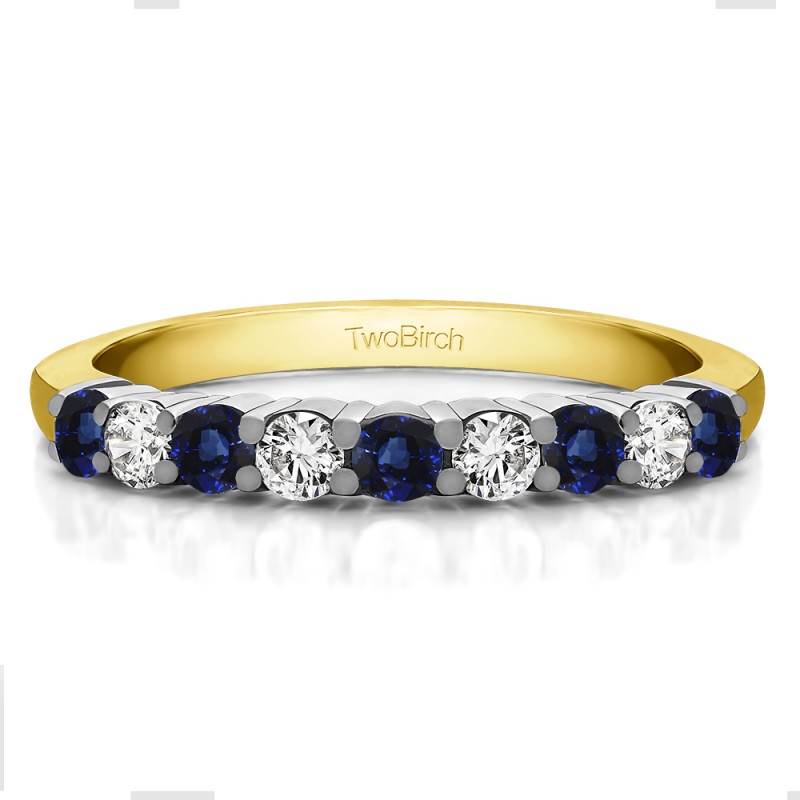 This wedding ring features 9 round prong set stones with a 2 millimeter wide band. The total combined carat weight of the ring is 0.5 carats. It features a double row of shared prong set round stones. This wedding ring weighs approximately 2.87 grams.