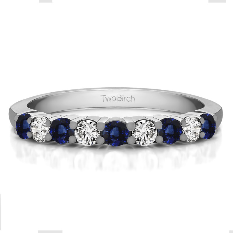 This wedding ring features 9 round prong set stones with a 2 millimeter wide band. The total combined carat weight of the ring is 0.5 carats. It features a double row of shared prong set round stones. This wedding ring weighs approximately 2.87 grams.