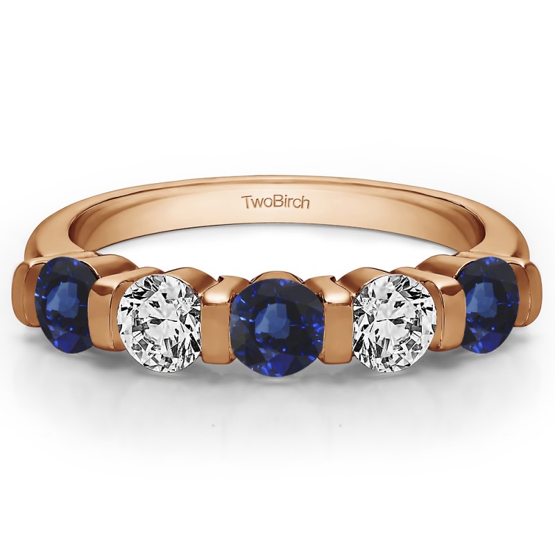 This wedding ring features 5 round bar set stones with a 2 millimeter wide band. The total combined carat weight of the ring is 0.5 carats. Stones are set in a high polished bar, giving it both stability and grace. This wedding ring weighs approximately 3.03 grams.