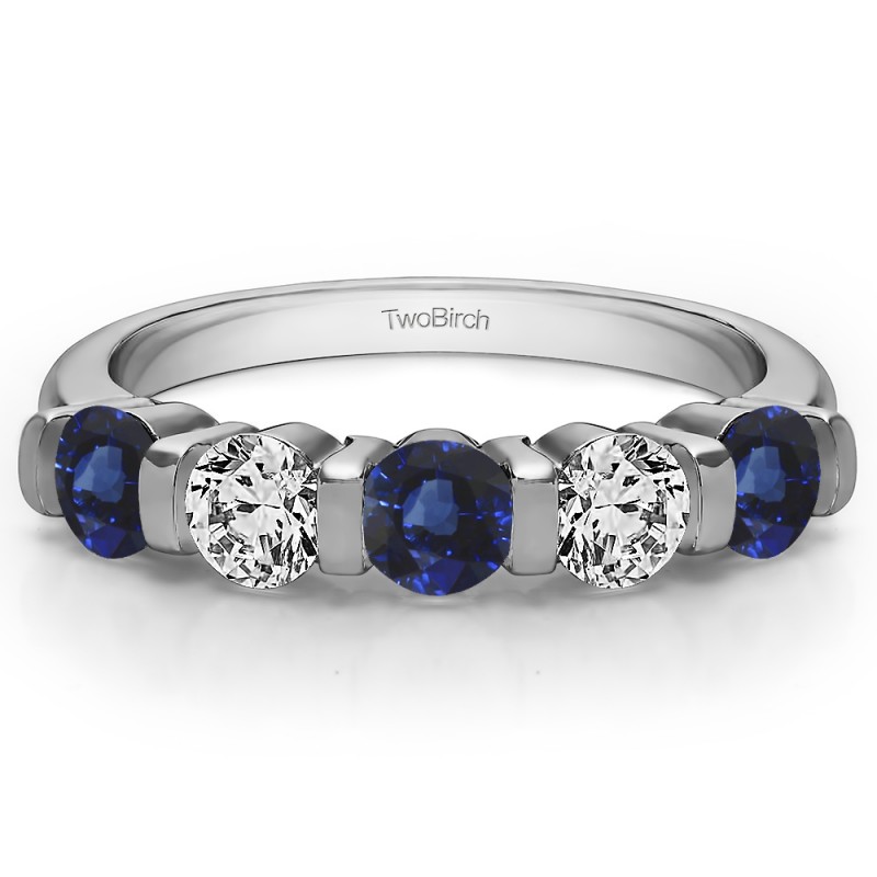 This wedding ring features 5 round bar set stones with a 2 millimeter wide band. The total combined carat weight of the ring is 0.5 carats. Stones are set in a high polished bar, giving it both stability and grace. This wedding ring weighs approximately 3.03 grams.