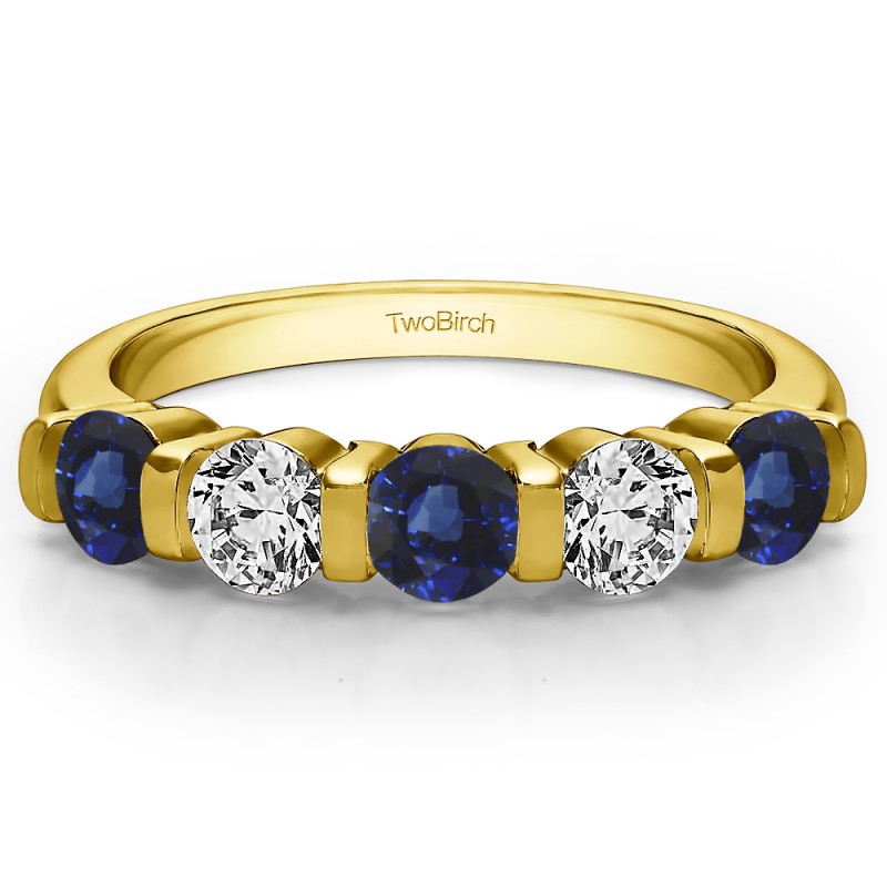 This wedding ring features 5 round bar set stones with a 2 millimeter wide band. The total combined carat weight of the ring is 0.5 carats. Stones are set in a high polished bar, giving it both stability and grace. This wedding ring weighs approximately 3.03 grams.
