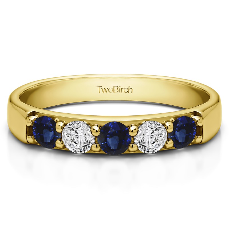 This wedding ring features 5 round prong set stones with a 2 millimeter wide band. The total combined carat weight of the ring is 0.5 carats. Stones in this wedding ring are set low, making it a perfect match for most engagement rings. It is also wide enough to be worn on its own, without any engagement ring. This wedding ring weighs approximately 4.81 grams.