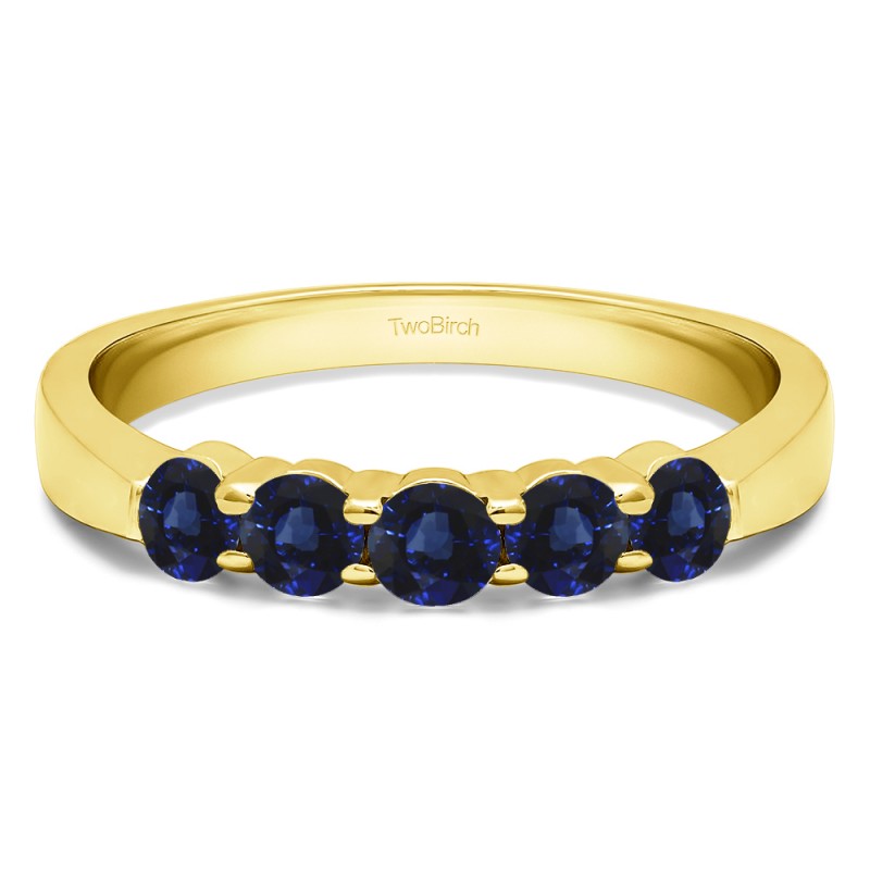 This wedding ring features 5 round prong set stones with a 2 millimeter wide band. The total combined carat weight of the ring is 0.5 carats. It has a high polish finish. This wedding ring weighs approximately 3.68 grams.