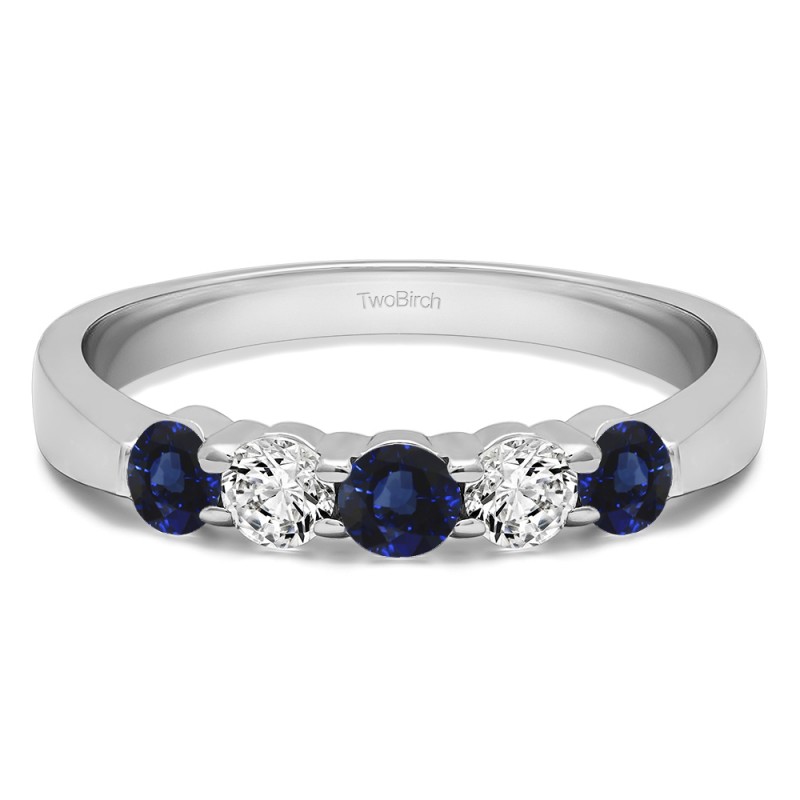 This wedding ring features 5 round prong set stones with a 2 millimeter wide band. The total combined carat weight of the ring is 0.5 carats. It has a high polish finish. This wedding ring weighs approximately 3.68 grams.
