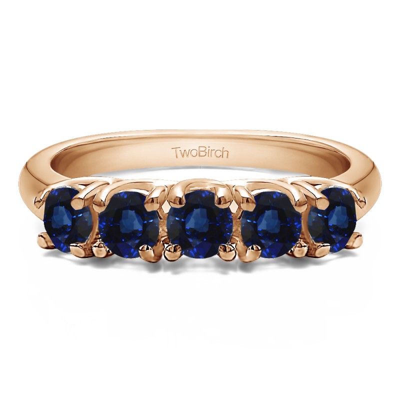 This wedding ring features 5 round prong set stones with a 2 millimeter wide band. The total combined carat weight of the ring is 0.5 carats. From the top, this wedding ring appears to be a traditional five stone wedding ring, set with shared prongs. From the profile view, the ring has a very unique trellis style setting. This wedding ring weighs approximately 4.75 grams.