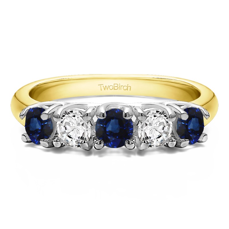 This wedding ring features 5 round prong set stones with a 2 millimeter wide band. The total combined carat weight of the ring is 0.5 carats. From the top, this wedding ring appears to be a traditional five stone wedding ring, set with shared prongs. From the profile view, the ring has a very unique trellis style setting. This wedding ring weighs approximately 4.75 grams.