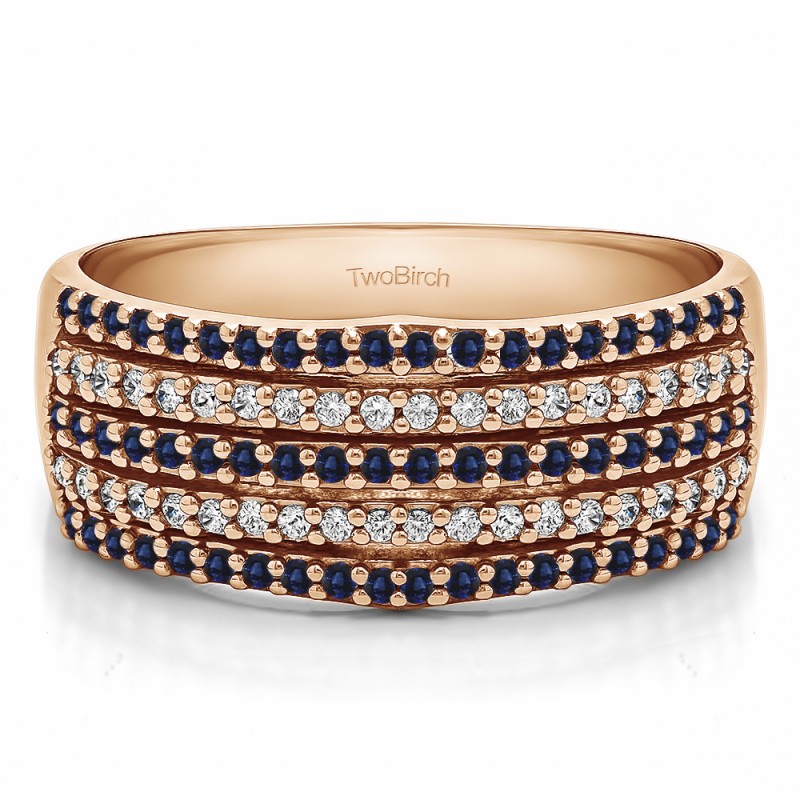 This wedding ring features 100 round prong set stones with a 2 millimeter wide band. The total combined carat weight of the ring is 0.5 carats. It has multiple rows of shred prong set round stones. This wedding ring weighs approximately 8.71 grams.