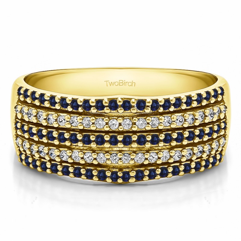 This wedding ring features 100 round prong set stones with a 2 millimeter wide band. The total combined carat weight of the ring is 0.5 carats. It has multiple rows of shred prong set round stones. This wedding ring weighs approximately 8.71 grams.