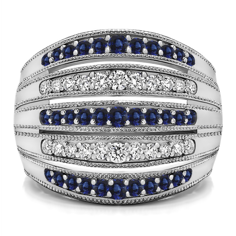 This wedding ring features 45 round prong set stones with a 2 millimeter wide band. The total combined carat weight of the ring is 0.52 carats. The band is very wide and has a domed design with five rows of stones. This wedding ring weighs approximately 7.51 grams.
