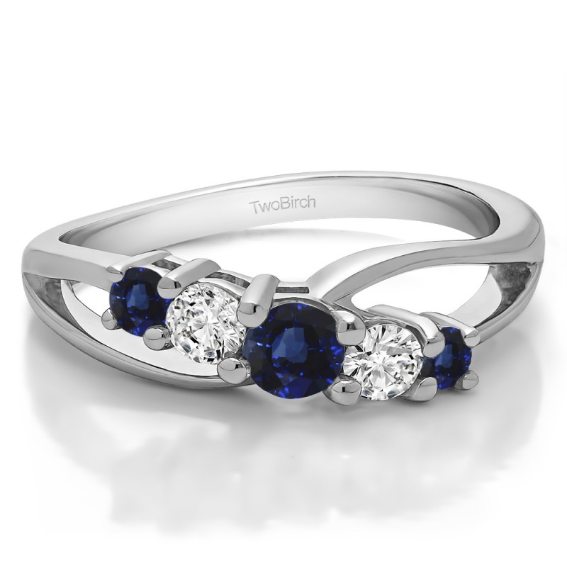 This wedding ring features 5 round prong set stones with a 2 millimeter wide band. The total combined carat weight of the ring is 0.53 carats. It has an infinity cut out design with one row of round stones set with shared prongs. This wedding ring weighs approximately 4.61 grams.