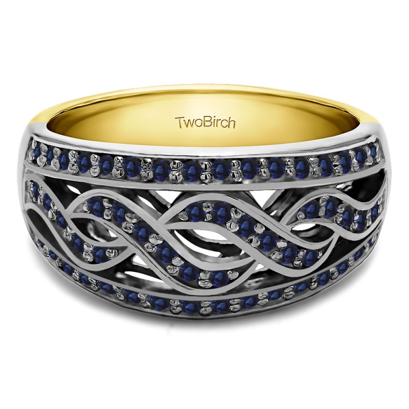 This wedding ring features 54 round prong set stones with a 2 millimeter wide band. The total combined carat weight of the ring is 0.54 carats. It features an infinity braid in the center. This wedding ring weighs approximately 9.31 grams.