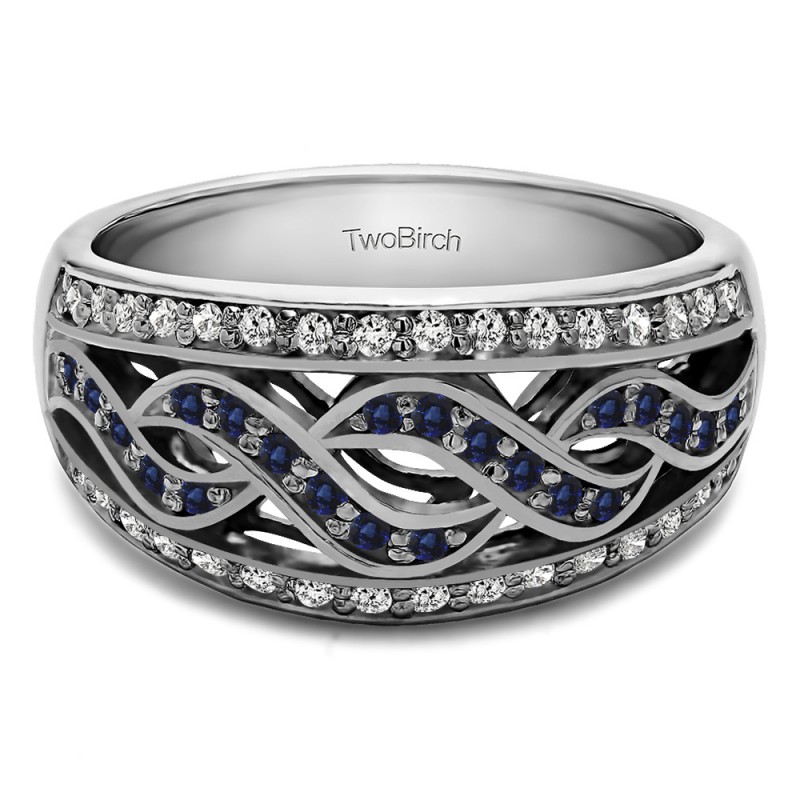 This wedding ring features 54 round prong set stones with a 2 millimeter wide band. The total combined carat weight of the ring is 0.54 carats. It features an infinity braid in the center. This wedding ring weighs approximately 9.31 grams.