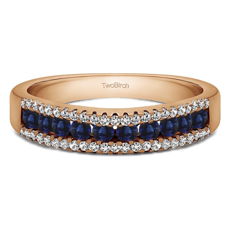 This wedding ring features 60 round prong set stones with a 2 millimeter wide band. The total combined carat weight of the ring is 0.6 carats. It has one large row of stones with smaller stones on each side. This wedding ring weighs approximately 4.64 grams.