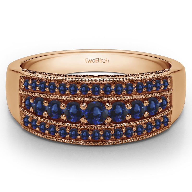 This wedding ring features 39 round prong set stones with a 2 millimeter wide band. The total combined carat weight of the ring is 0.71 carats. It has one wide row of stones surrounded by one row of smaller stones on each side and millgrained edges. This wedding ring weighs approximately 11.82 grams.